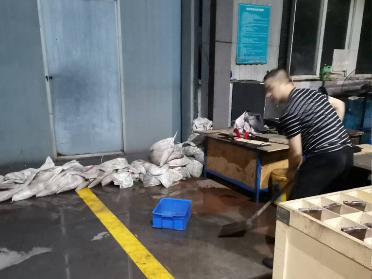 “雨水快漫入車(chē)間了,兄弟們加把勁砌好沙袋!”8月16日凌晨3點(diǎn),仟坤集團(tuán)黨委書(shū)記、集團(tuán)副總裁周述軍在鑫坤機(jī)械廠(chǎng)區(qū)車(chē)間指揮工人防洪搶險(xiǎn),因地勢(shì)原因鑫坤機(jī)械廠(chǎng)區(qū)的雨水逐漸漫過(guò)地臺(tái),車(chē)間里全是機(jī)械設(shè)備和金屬器件,堵住即將漫入的雨水是當(dāng)務(wù)之急。排水、封堵刻不容緩,一排沙袋,兩排沙袋,慢慢構(gòu)筑起一道道堅(jiān)實(shí)的防線(xiàn)。隨著排水口的疏通水位下降,提到嗓子眼的心才逐漸放下。此時(shí)已是早晨八點(diǎn),但是周書(shū)記并未停下腳步調(diào)整休息,繼續(xù)帶領(lǐng)著各車(chē)間主任排查漏水和漏電的安全隱患。