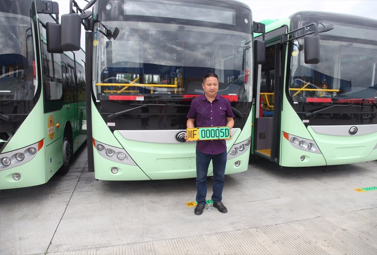 與小型新能源車不同的是,大型新能源汽車專用號牌底色采用黃綠雙拼色,前五位使用數(shù)字,第六位啟用字母,D代表純電動新能源汽車,F(xiàn)代表非純電動新能源汽車。新能源汽車號牌采用了新的防偽技術和制作工藝,含有防偽底紋暗記、二維碼、激光圖案等,號牌輪廓尺寸和普通汽車號牌也有不同。新能源車號牌與宏運公交的純電動公交車身綠色圖案相呼應,凸顯了綠色、環(huán)保、科技的理念。