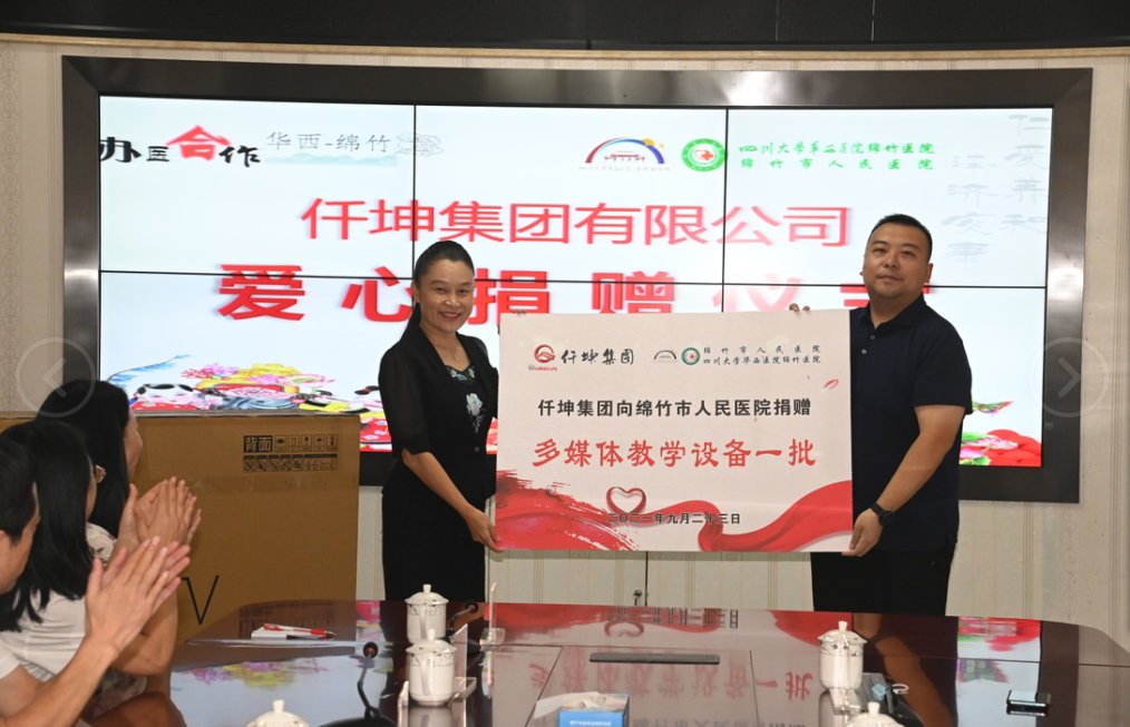 9月23日,仟坤集團(tuán)向綿竹市人民院捐贈(zèng)多媒體教學(xué)設(shè)備儀式在綿竹市人民醫(yī)院行政樓舉行。集團(tuán)總裁謝澤波,綿竹市紅十字會(huì)秘書長趙曉梅,綿竹市人民醫(yī)院黨委書記張琴出席儀式,綿竹市人民醫(yī)院副院長陳浩主持儀式。
