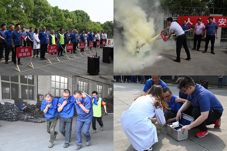 “報告總指揮,上午10點熱處理車間因電路問題出現(xiàn)火災(zāi)”演練在報告聲中拉開序幕。警戒組、疏散組、救護組、搶險組、救援組6支小分隊迅速展開行動。警戒組持警戒帶對現(xiàn)場進行封控;搶險組持滅火器沖入火場,一拉、二瞄、三壓住,一氣呵成撲滅大火;疏散組持彩色發(fā)光棒,引導(dǎo)被困職工捂住口鼻脫離火場;救援組為及時受傷職工處理傷口...各小組配合默契,整體流程銜接流暢,展現(xiàn)出了參演人員的卓越團隊協(xié)作能力和在緊急情況下的應(yīng)對能力和反應(yīng)力?,F(xiàn)場所有參演及觀摩人員還對進行了滅火的實際操作。