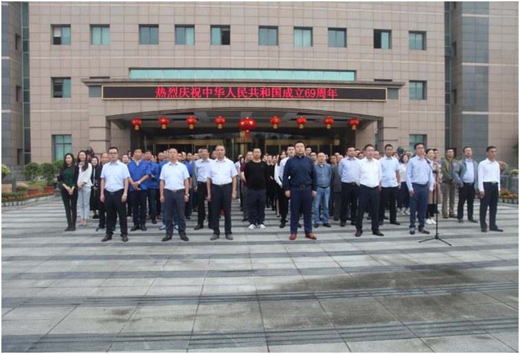 為喜迎中華人民共和國(guó)建國(guó)69周年,9月30日上午,集團(tuán)總裁謝澤波,常務(wù)副總裁葉金春,黨委書(shū)記、副總裁周述軍,副總裁趙新強(qiáng)以及集團(tuán)其它高層領(lǐng)導(dǎo)、各事業(yè)部中層以上管理人員和集團(tuán)總部員工著裝整齊的列隊(duì)于總部辦公樓前,隆重舉行升國(guó)旗儀式,在國(guó)旗護(hù)衛(wèi)隊(duì)護(hù)衛(wèi)下,鮮艷的五星紅旗在雄壯豪邁的國(guó)歌聲中冉冉升起,全體人員肅立旗桿下,向著國(guó)旗莊嚴(yán)地行注目禮。